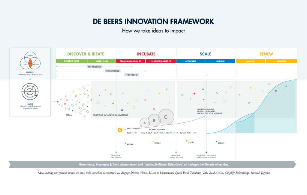 It is a group-wide model that defines what the innovation phases at De Beers are, geared towards the company’s values, ambitions and industry context.