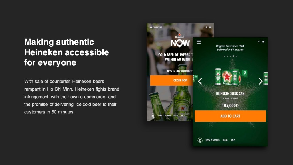 To address this, Heineken launched its own e-commerce platform, promising to deliver authentic, ice-cold beer to customers within 60 minutes.